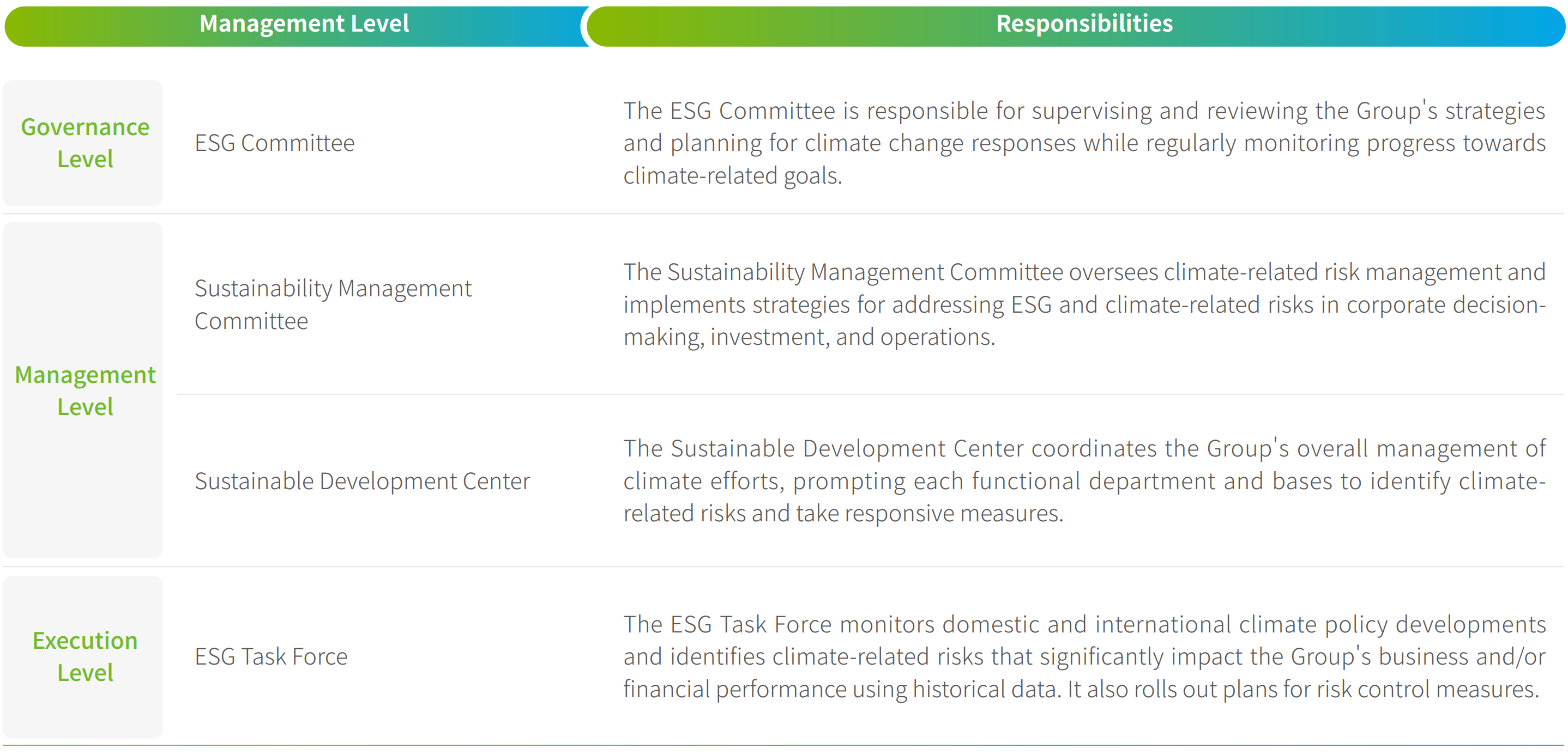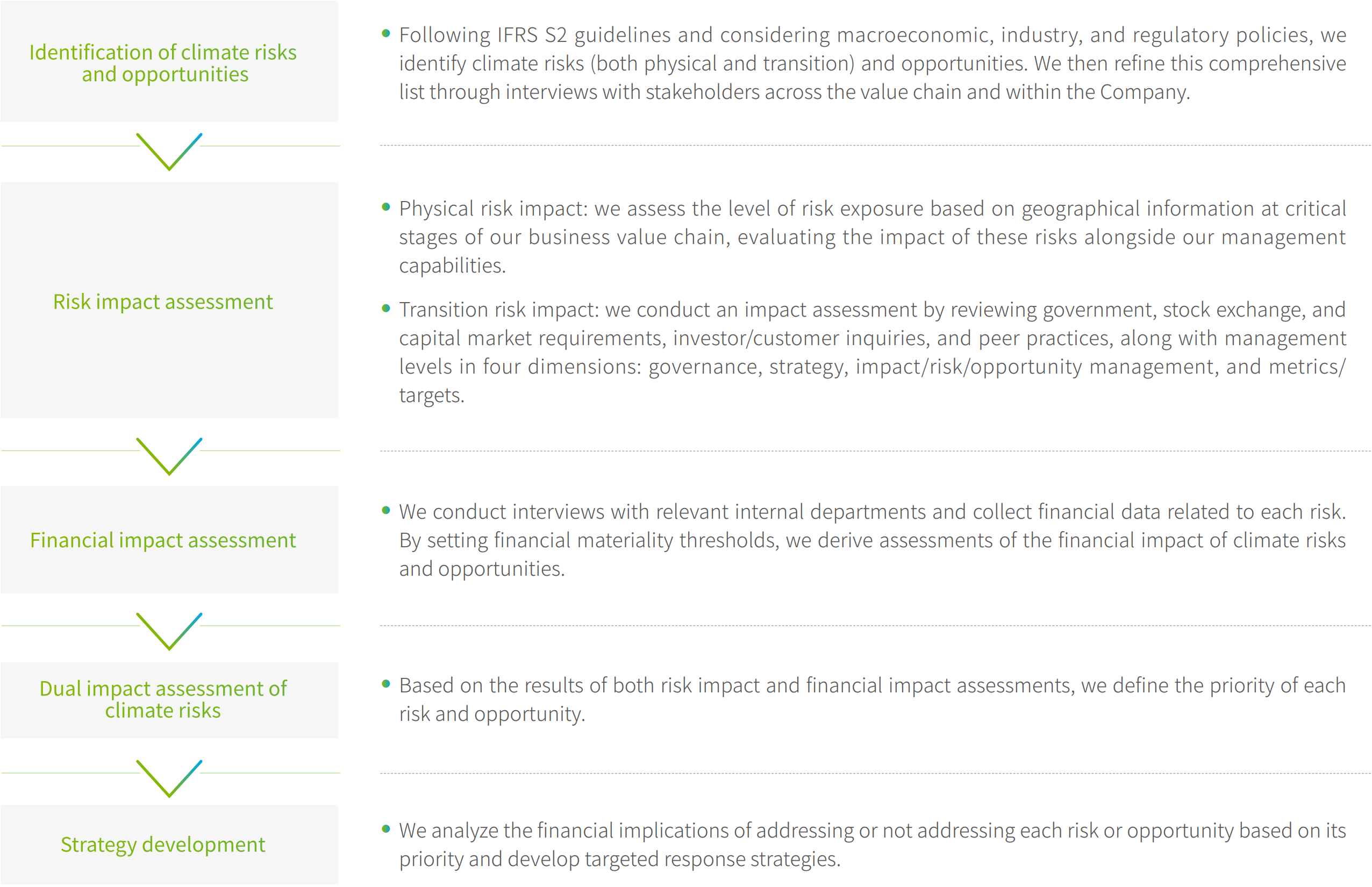 The Group has developed an integrated management process for climate risks andopportunities, incorporating assessments of their significance and financial impact to crafteffective response strategies. This creates a closed-loop system for identifying, evaluating,and managing climate risks.