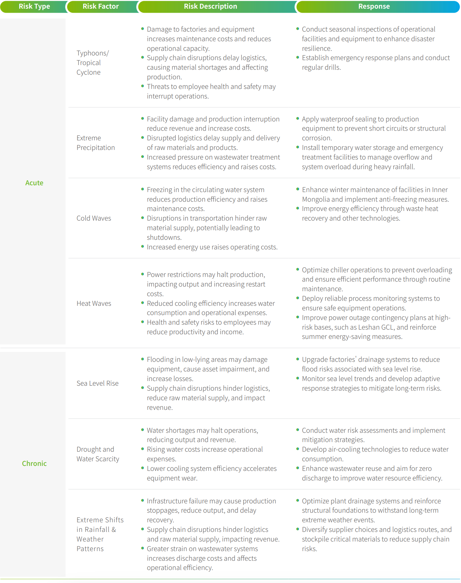 To develop effective climate change response strategies, we have identified and evaluated climate-related risks and opportunities across all business segments and advanced the next phase of work progressively. In 2024, we assessed the importance and financial impact of climate risks by collecting financial data and climate-related indicators from key stages in thevalue chain of our polysilicon segment. This assessment considered international climate scenarios to formulate targeted response strategies aimed at enhancing our climate resilience.
