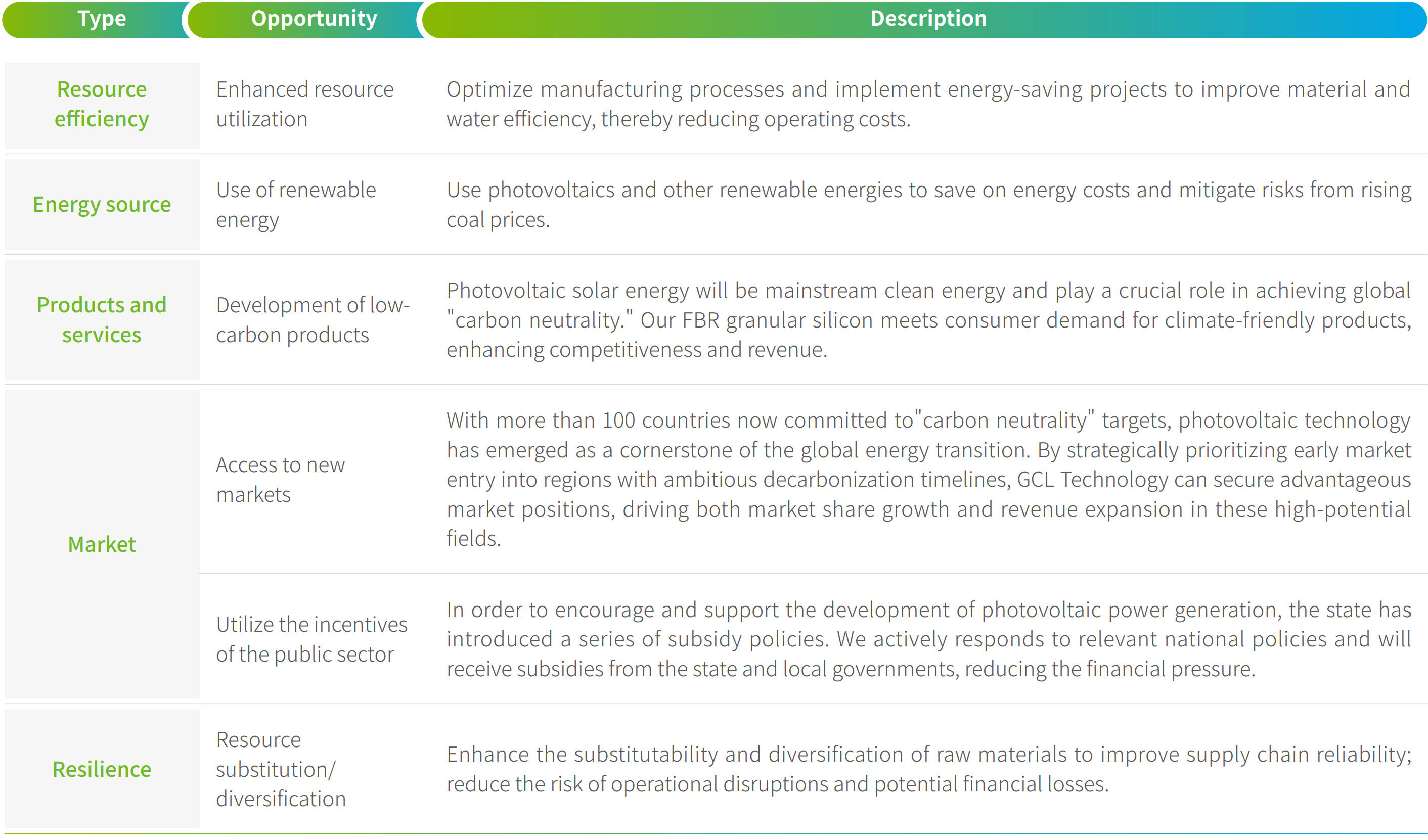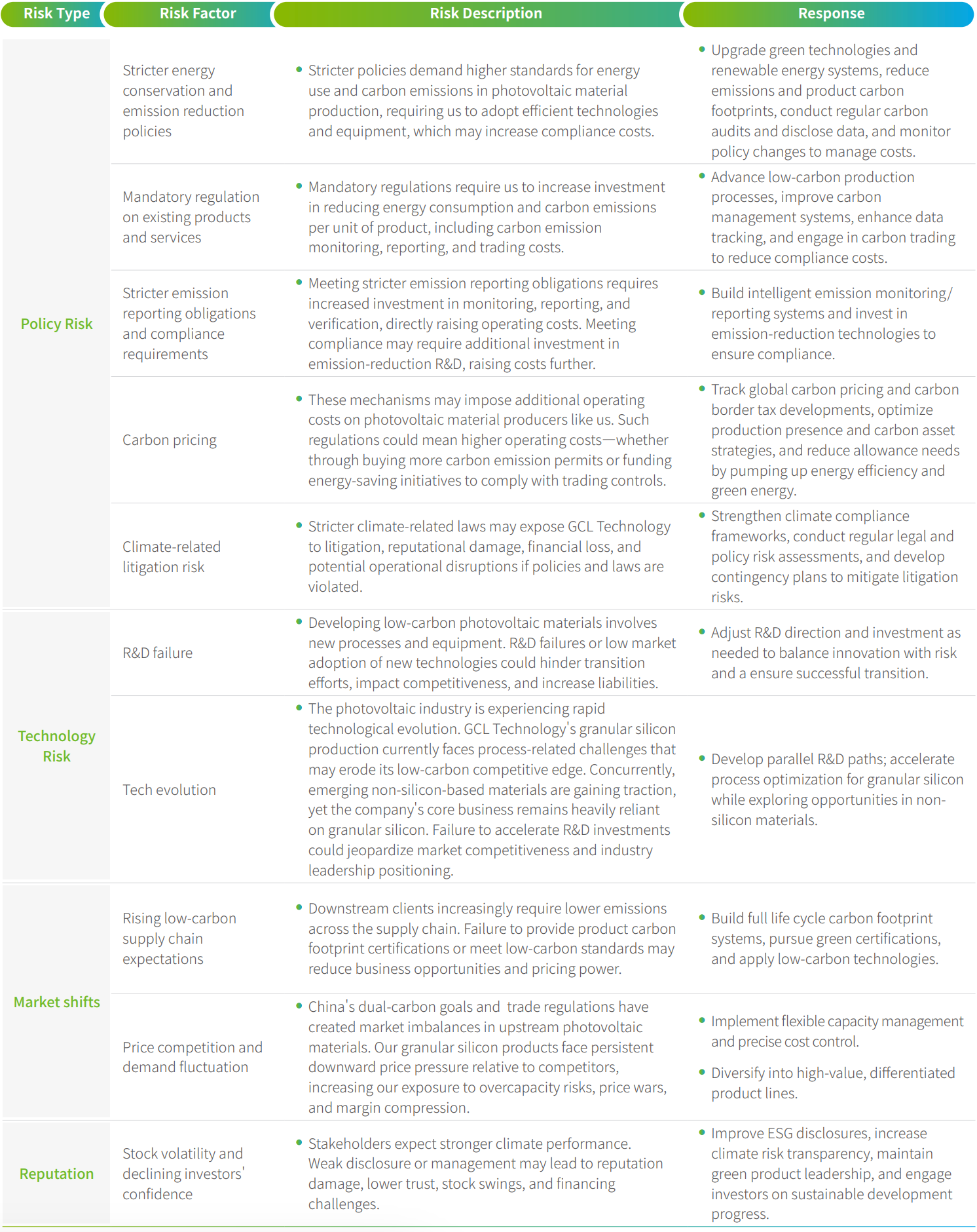 GCL Technology fully recognizes the impact of climate change on its strategic planning and business operations. Therefore, the Group has integrated climate change into its overall ESG governance framework. In line with the framework and recommendations of the Task Force on Climate-related Financial Disclosures (TCFD), it carries out climate change risk management and enhances its response capabilities. To further address the risks and opportunities posed by climate change, the Group plans to establish and improve its climate change governance system, deepen the involvement of the Board of Directors and various business units, strengthen the identification and assessment of climate-related risks, continuously advance carbon accounting and carbon reduction planning, and fully implement specialized initiatives for climate change response.