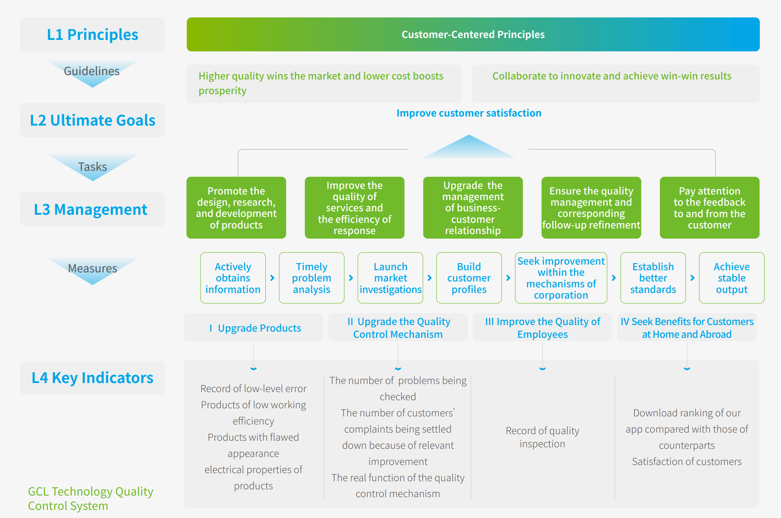 • Driven by the concept of "exquisite craftsmanship, conscientious quality'", GCL Technology has focused on five major qualitydevelopment directions: standardized work processes, lean management, quality first, continuous improvement, and customersatisfaction. Upholding the spirit of puting customers at the centre, we have developed a quality management system that strengthensboth internal and external practices.