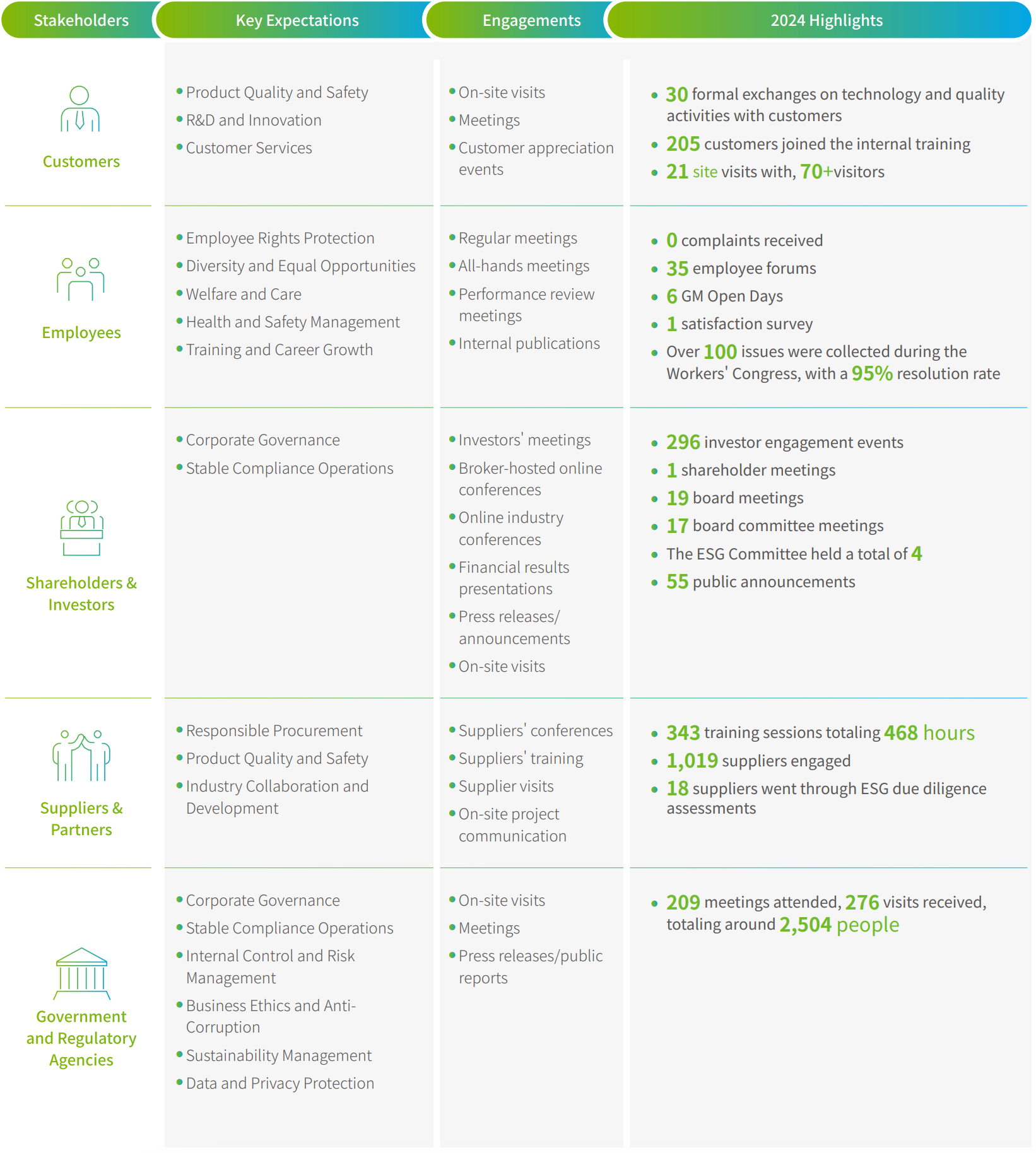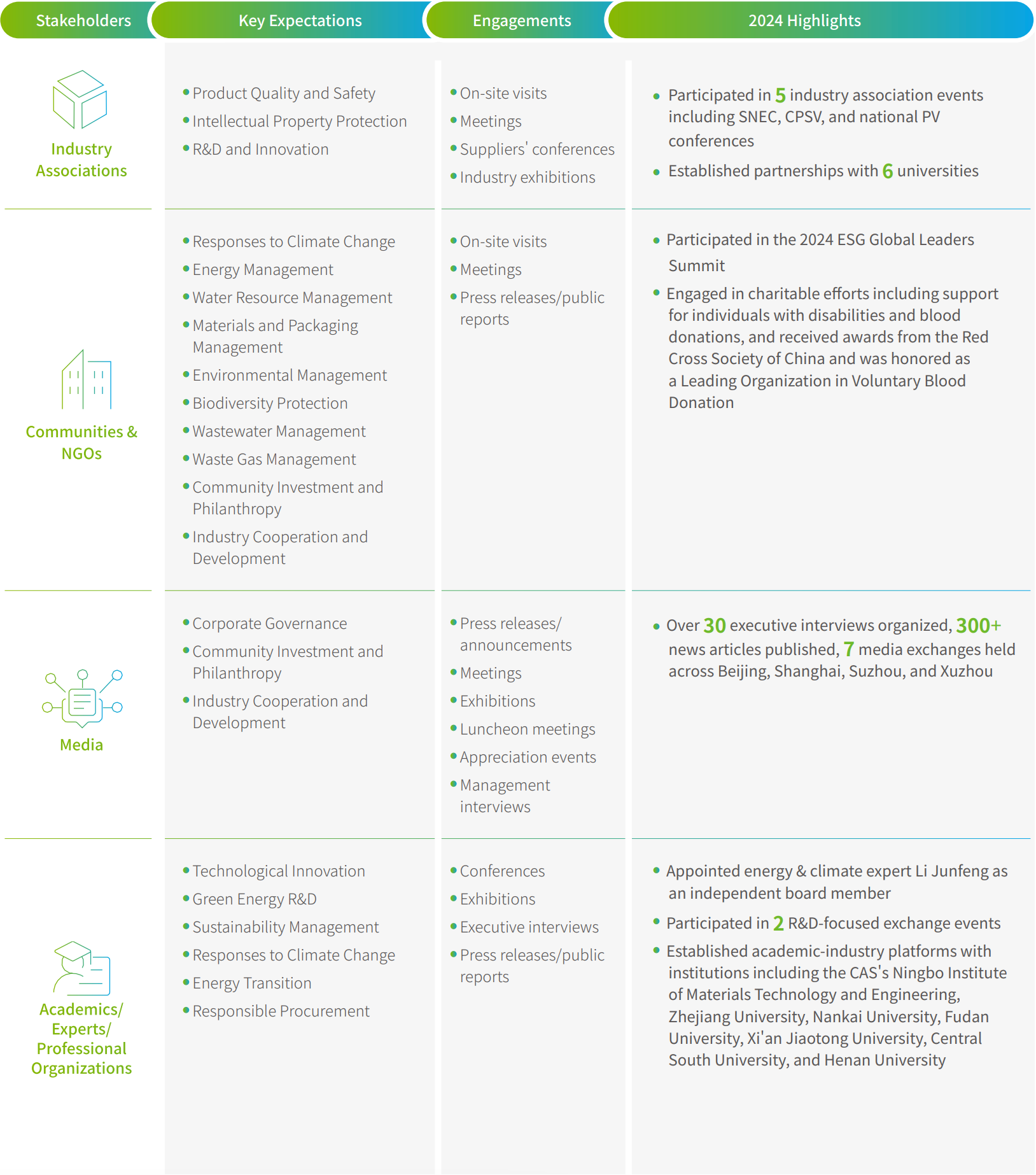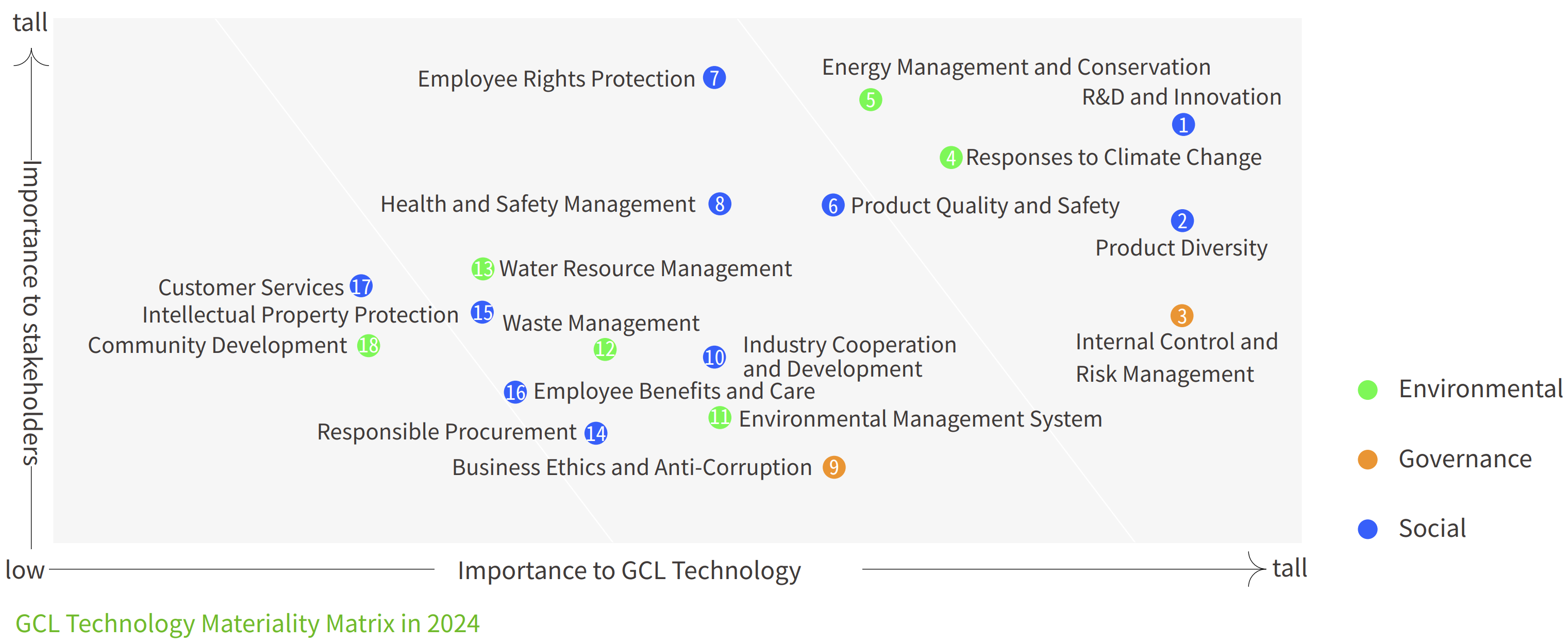 GCL Technology attaches great importance to communication with stakeholders. By establishing a transparent and efficient communication mechanism, the Group proactively responds to the concerns of all parties, ensures that its actions in environmental, social and governance (ESG) areas are aligned with stakeholders’ expectations, and strives for shared development. Based on research conducted in 2024, 18 material issues were jointly identified by internal and external stakeholders from a total of 29 issues.